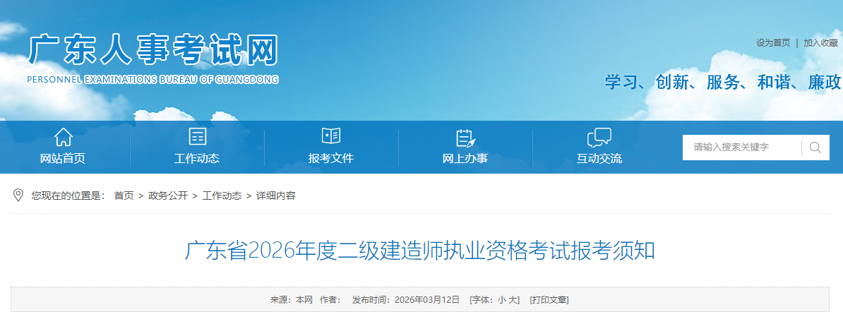 根据广东省人力资源和社会保障厅《关于广东省人力资源社会保障系统2026年度专业技术人员职业资格考试工作计划及有关事项的通知》(粤人社函〔2026〕37号)要求,广东省2026年度二级建造师执业资格考试于5月30日、31日举行,考试形式为计算机化考试(机考)。为方便广大考生报考该项考试,现将有关事项告知如下。