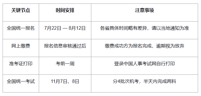 根据中国人事考试网发布的《2026年度专业技术人员职业资格考试重要事项提示》,全国统一报名窗口期为7月22日至8月12日。各省将在该时间段内自行确定具体报名起止日期,报名周期通常为10-20天,不设补报名。