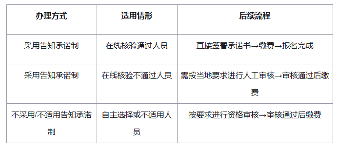 采用告知承诺制但身份、学历信息在线核验不通过的考生,需按要求进行人工审核,审核通过后方可缴费。