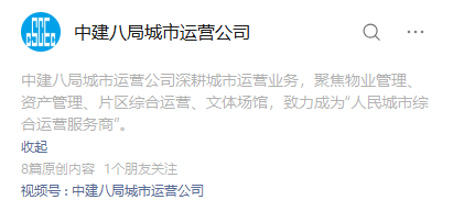 根据中建八局城市运营公司官方微信公众号的最新介绍,该平台将致力于城市运营业务,重点聚焦物业管理、资产管理、片区综合运营、文体场馆运营等核心领域。
