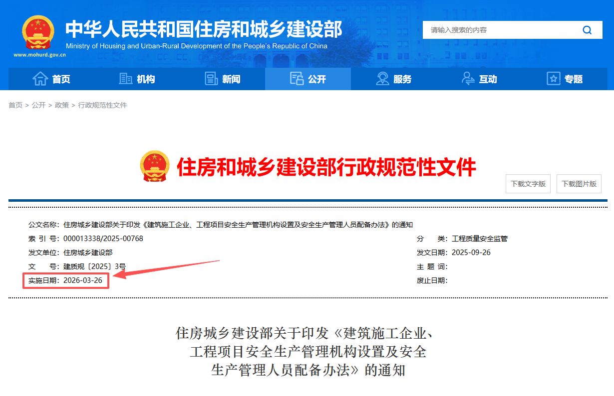 此前,住房城乡建设部印发《建筑施工企业、工程项目安全生产管理机构设置及安全生产管理人员配备办法》,新政策已于2026年3月26日起正式实施。