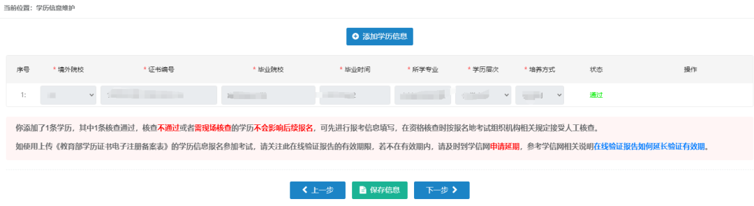 2、“未核查”、“需要现场核查”、“核查不通过”并且未在考试内使用的学历/学位信息可以自行删除。