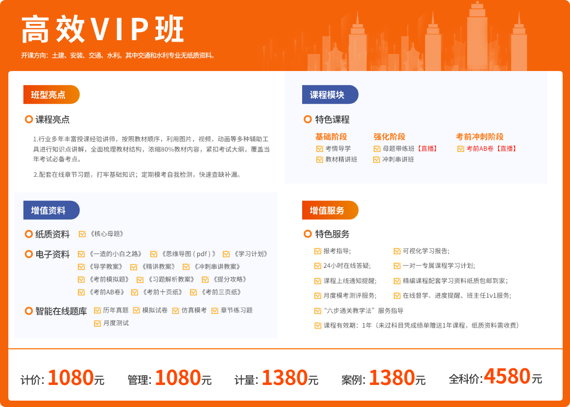 | 封闭密训班 | 管理 | 本班次含金量极高,集训4天,适合有一定基础的考生;计量和案例科目开设土建、安装、交通、水利 |