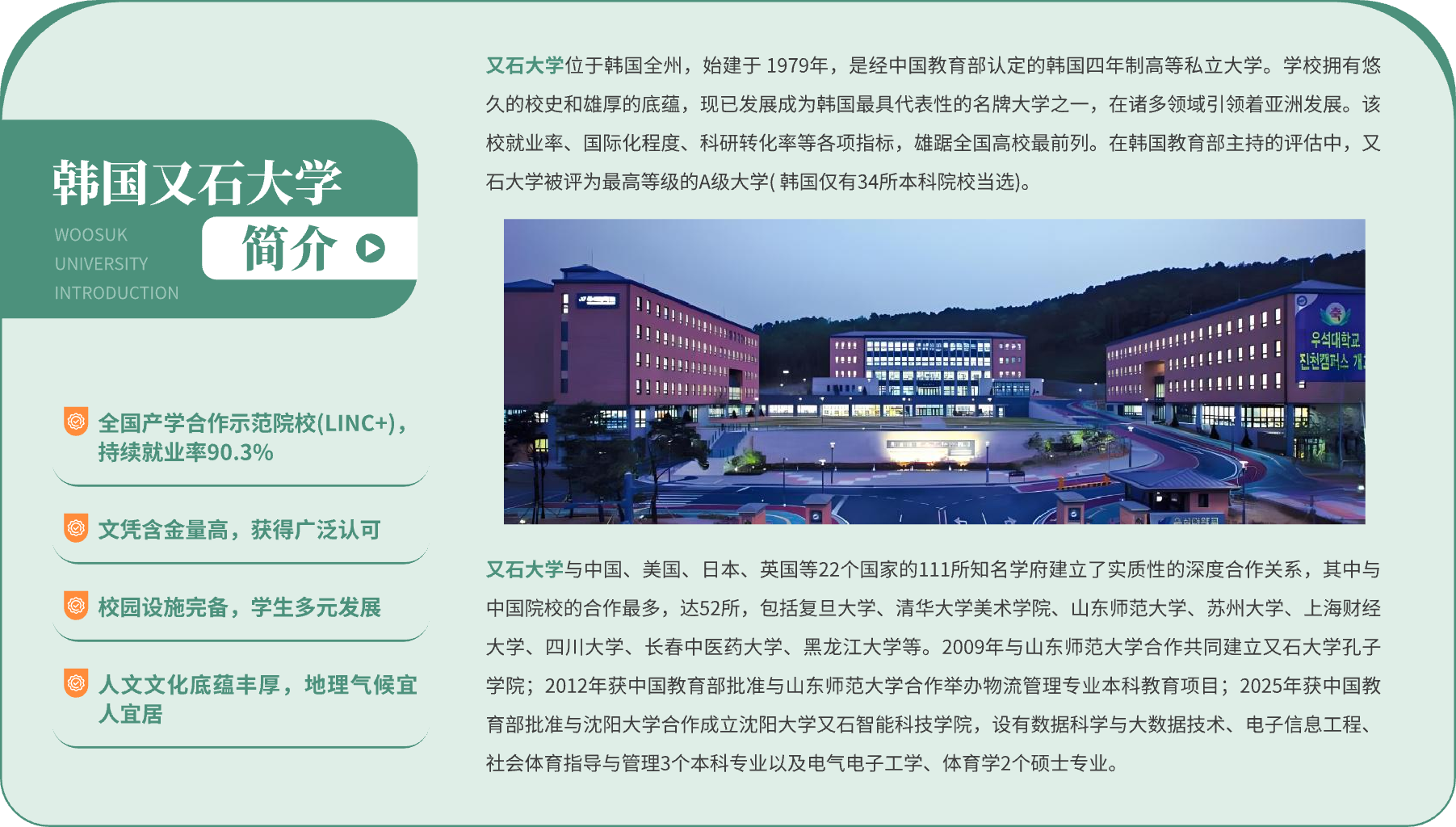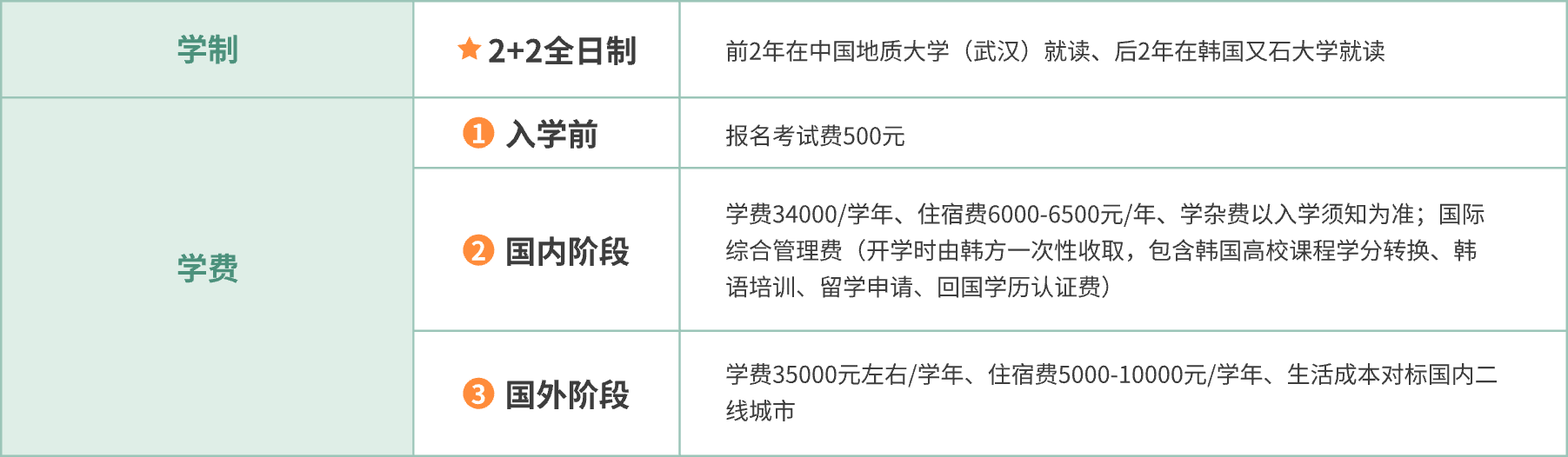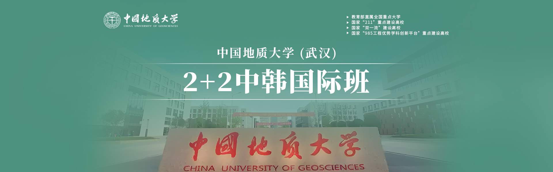 中国地质大学(武汉)是中国(教育部)留学服务中心的全面战略合作伙伴。中国地质大学(武汉)与韩国又石大学2+2中韩国际班属于出国留学培训项目。项目属于学校计划外自主招生,无中国地质大学(武汉)学籍,学生入学注册韩国又石大学学籍。学生前两年在中国地质大学(武汉)学习韩语课程、平安留学、国情教育、基础课程及部分专业课程,两年内完成规定课程且韩语等级达标,即可赴韩国又石大学进行剩余两年课程学习。修满所有学分后颁发韩国又石大学学士学位证书,经中国(教育部)留学服务中心认证后,取得国外学历学位认证书,第一学历为本科,无国内前置学历。学生可继续申读韩国名校硕士,也可回国参加相关省市公务员及企事业单位招考、求职就业及创业等。