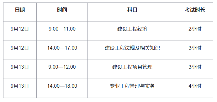 2026年一级建造师考试时间为9月12日至13日,具体安排如下: