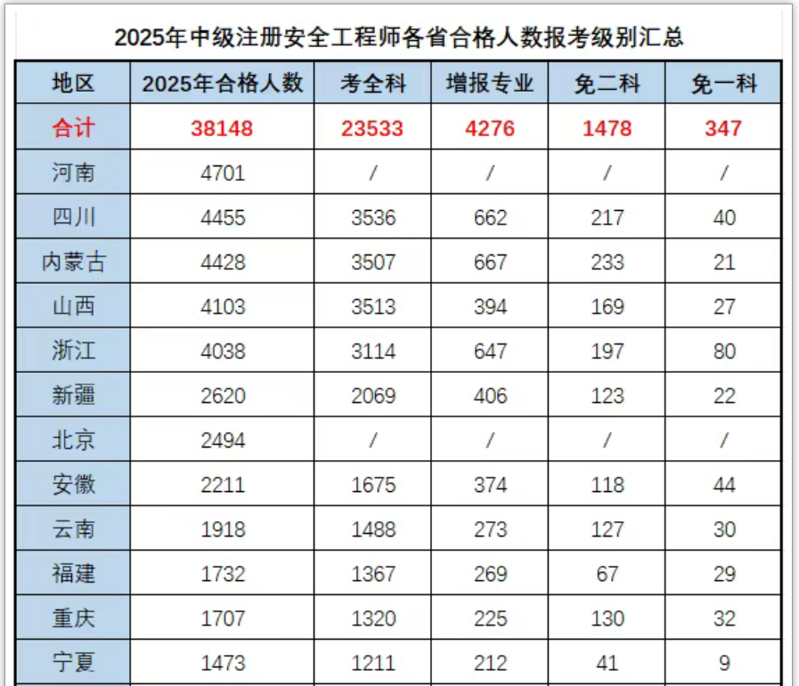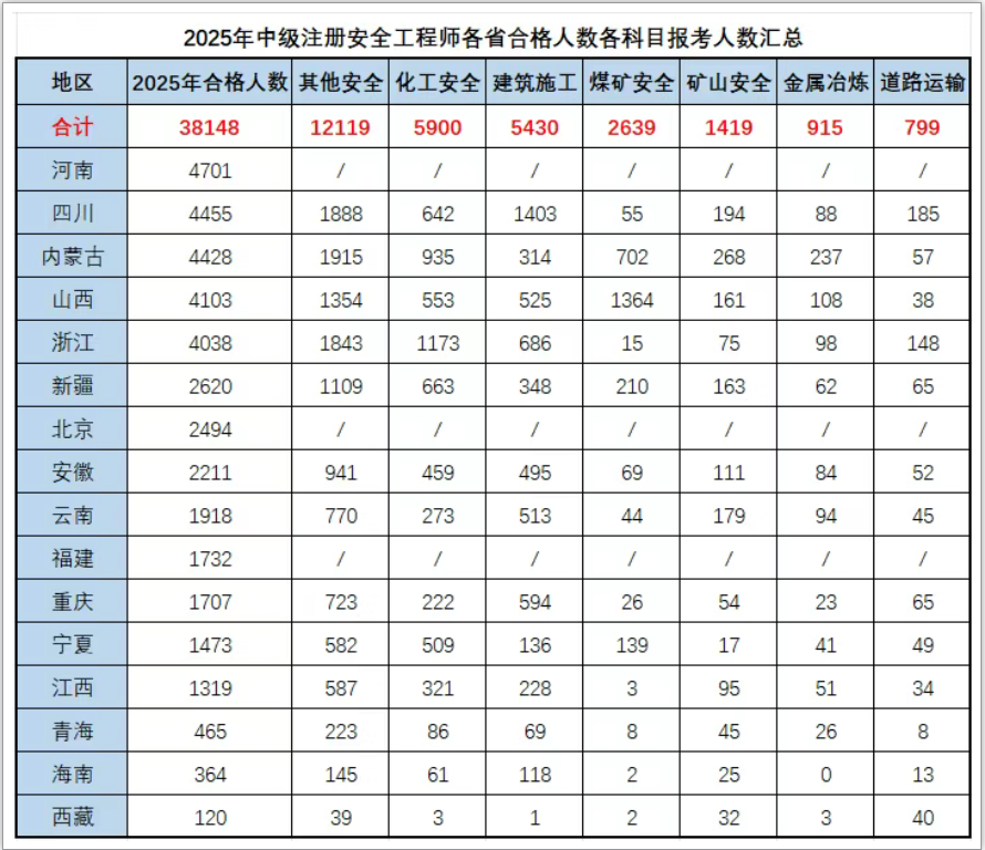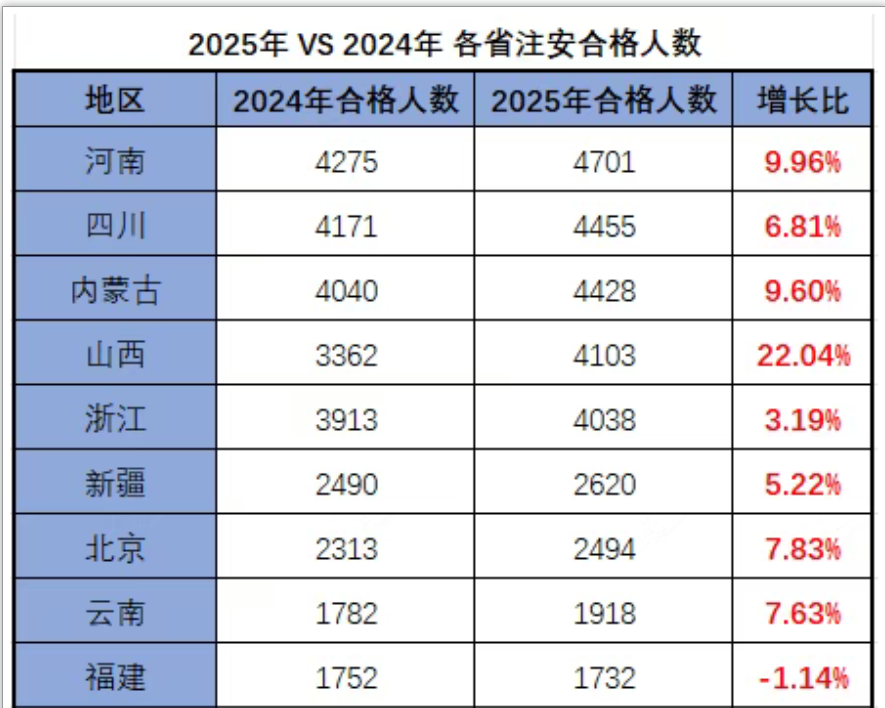 通过以上数据可以看出,2025年中级注安考试合格人数呈普遍增长态势,整体增长率7.95%,考试热度持续上升;