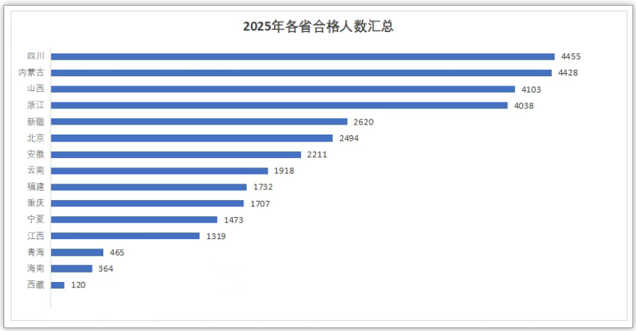 四川(4455人)、内蒙古(4428人)、山西(4103人)、浙江(4038人)紧随其后,均进入合格人数前五。