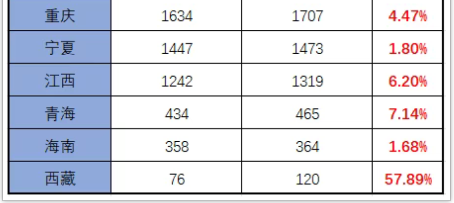 除福建出现1.14%的负增长外,其余16省合格人数均实现正增长,17省整体增长2648人,增长率达7.95%。