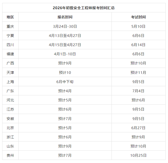 2026年初级注册安全工程师各省报名时间不尽相同,报名通道最早将于 3 月启动,详细时间安排如下表: