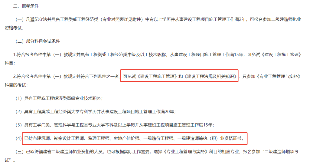 从福建省住建部发布的通知中,明确表示持有一级建造师的考生可免试《建设工程施工管理》和《建设工程法规及相关知识》,只参加《专业工程管理与实务》科目的考试。