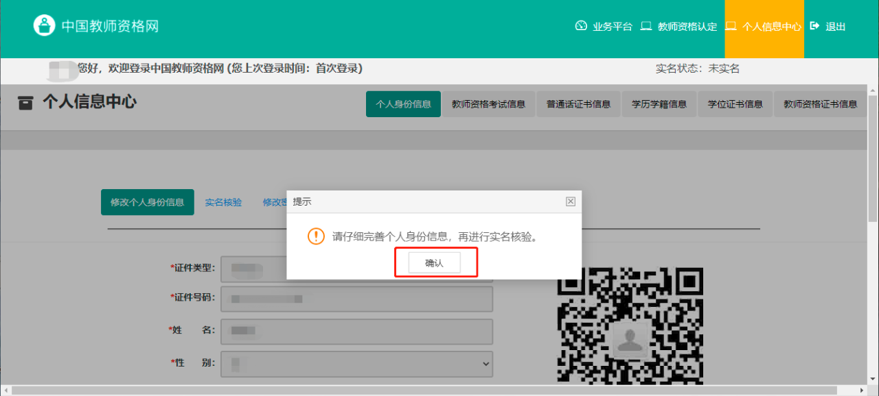 进入页面后,会弹出实名核验的提醒,点击“确定”即可。