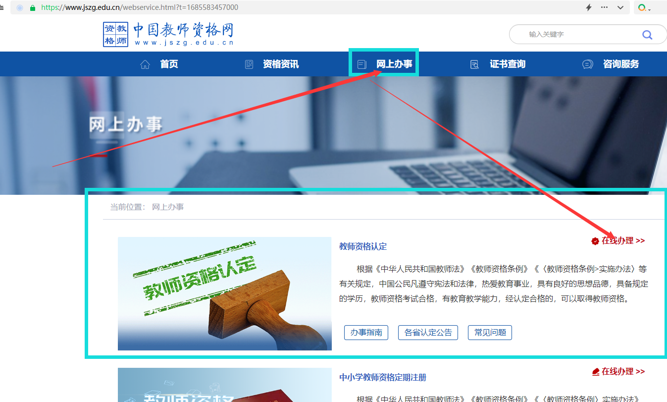 点击“网上办事”-教师资格认定在线办理。