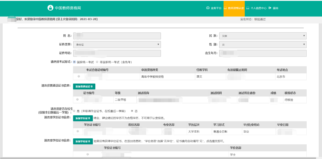 在右上方可以看到个人身份信息、教师资格考试信息、普通话证书信息、学历学籍信息、学位证书信息、教师资格证书信息六个类别。