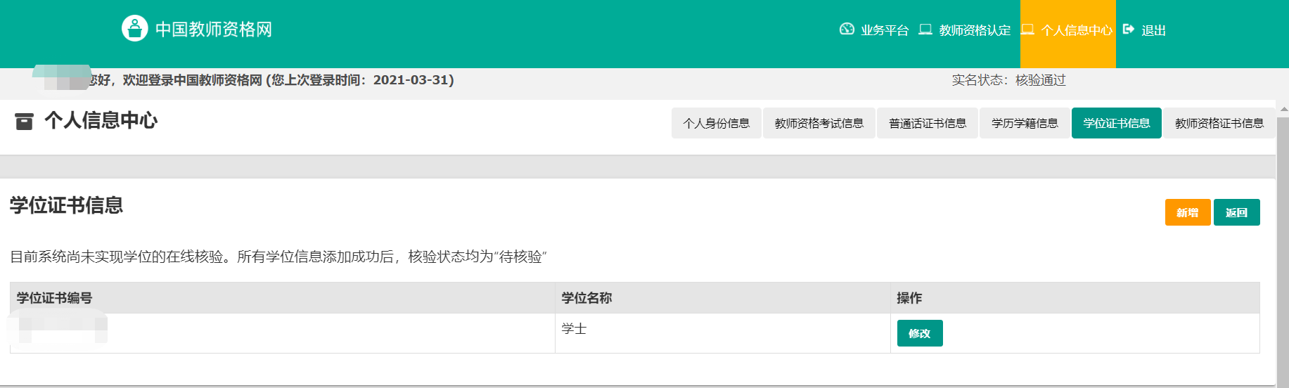 填写学历学位信息,需要用到实体证书,或者是电子版证书,用来填写编号,一般而言学历证书编号网上可以核验,但是网站没有开通学位证书在线核验,因此上传之后会一直是待核验状态。