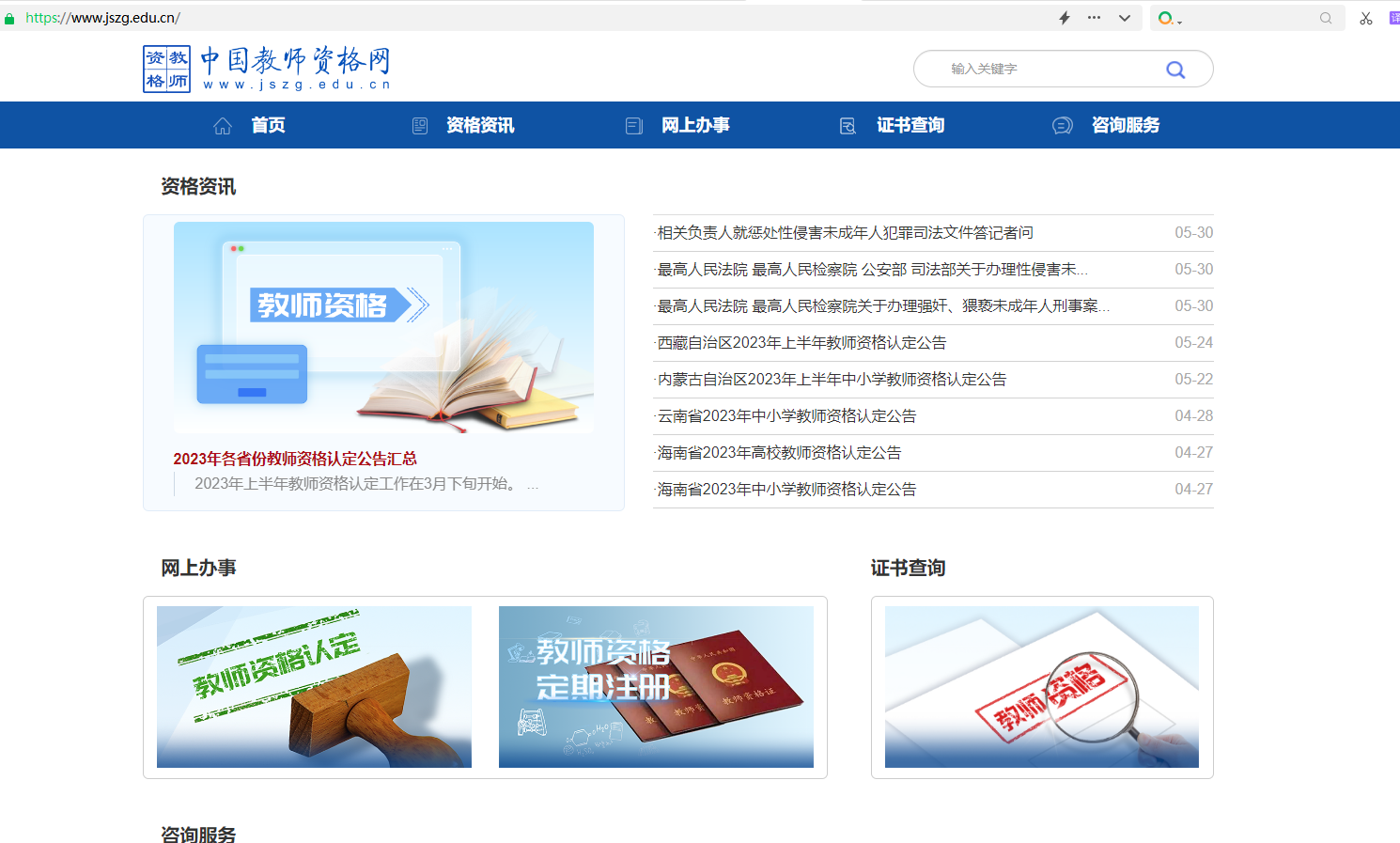 搜索中国教师资格网或者输入官网网址(www.jszg.edu.cn)进入教资认定官网。