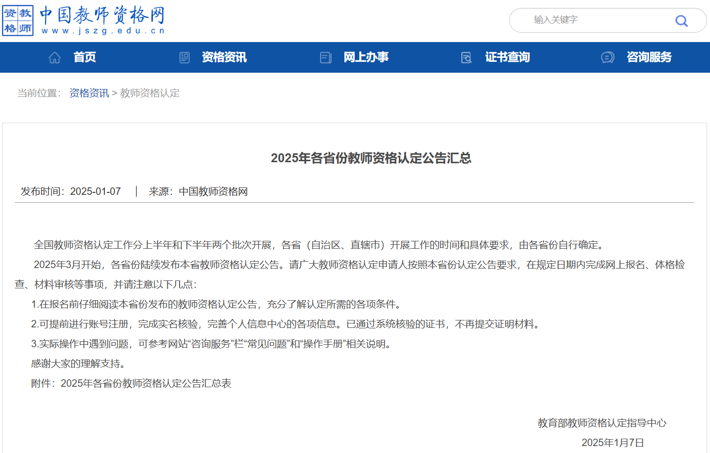 2025年3月开始,各省份陆续发布本省教师资格认定公告。请广大教师资格认定申请人按照本省份认定公告要求,在规定日期内完成网上报名、体格检查、材料审核等事项,并请注意以下几点: