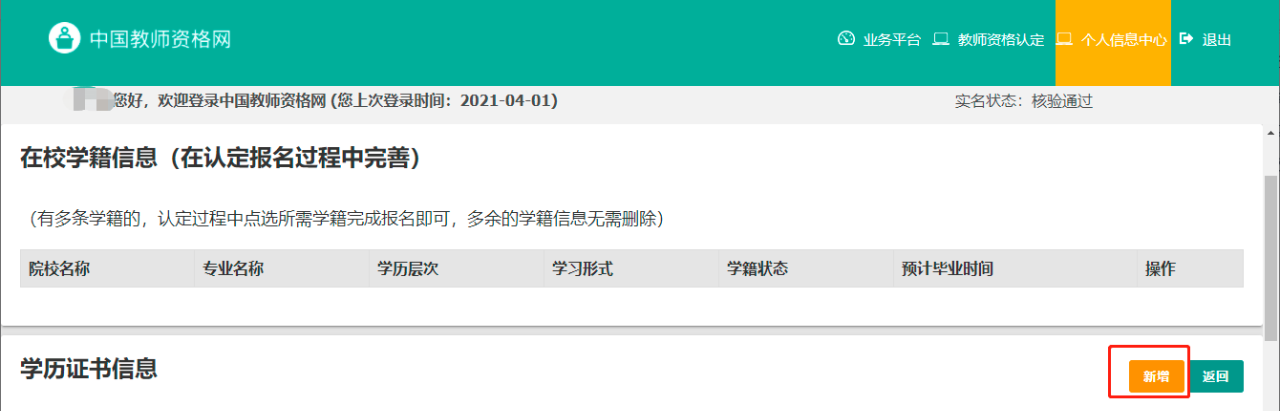 点击新增,添加学历信息。