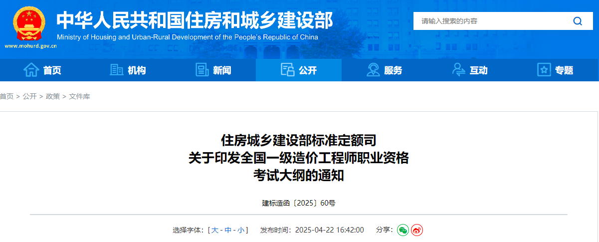 《全国一级造价工程师职业资格考试大纲》已发布,经人力资源社会保障部审定,现予印发,自2025年5月1日起施行。
