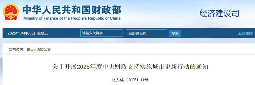 刚刚(4月8日),财政部和住建部联合发布《关于开展2025年度中央财政支持实施城市更新行动的通知》(财办建〔2025〕11号)。文件明确指出:加强消费型基础设施建设,注重向提振消费方面发力。