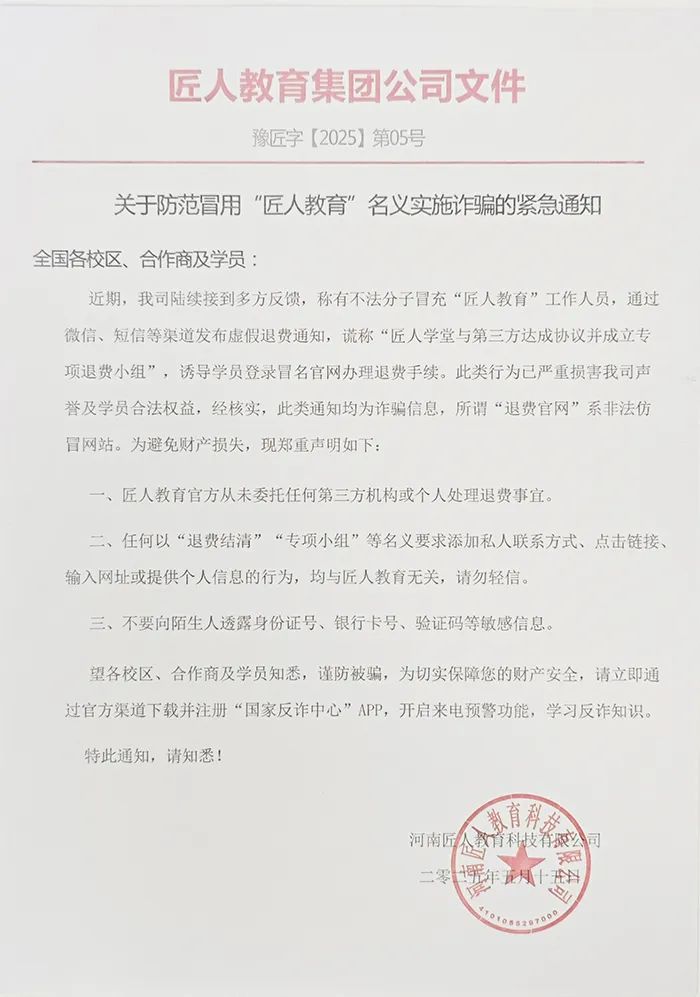 近来,本司收到学员反馈有诈骗分子假冒匠人集团进行诈骗活动,且诈骗套路层出不穷,包括但不限于利用短信、电话或微信QQ等方式联系学员,线上散布、线下邮寄虚假退费文件等。为此,我司已报警,严正声明如下:
