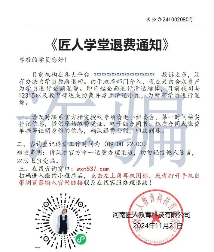 匠人教育不会专门建立微信退费群,也从未泄漏用户手机号及地址隐私信息,请学员们务必提高警惕!诈骗渠道信息来源广泛,请广大学员仔细辨别或与匠人教育客服、老师进行核实,以免上当受骗、遭受经济损失!!!