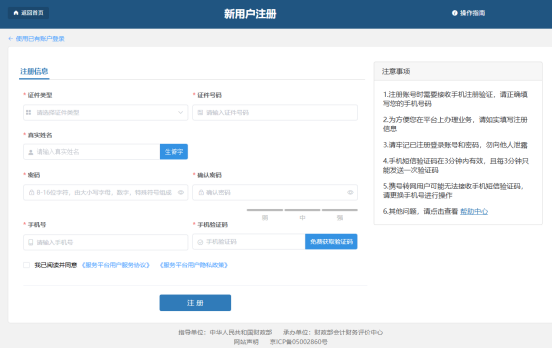 登录平台后点击右上角“注册”,进入注册页面填写注册信息,选择“证件类型”(如:内地居民身份证、港澳居民往来内地通行证、台湾居民来往内地通行证及护照),填写证件号码、真实姓名、密码、确认密码、手机号,填完所有信息后点击获取验证码,输入验证码后点击注册,完成注册操作。