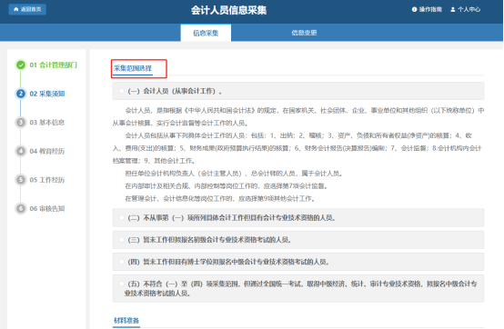 3.未从事会计工作但通过全国统一考试取得经济、统计、审计专业技术中级资格的,请选择“(五)不符合(一)至(四)项采集范围,但通过全国统一考试,取得中级经济、统计、审计专业技术资格,拟报名中级会计专业技术资格考试的人员。”