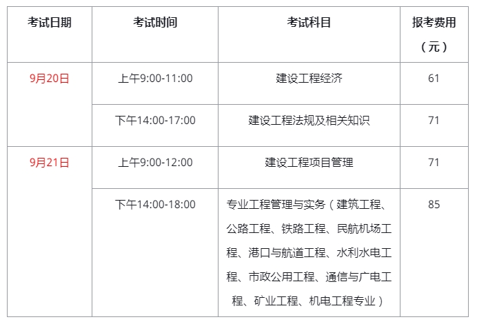 (一)考试时间、科目及报考费用: