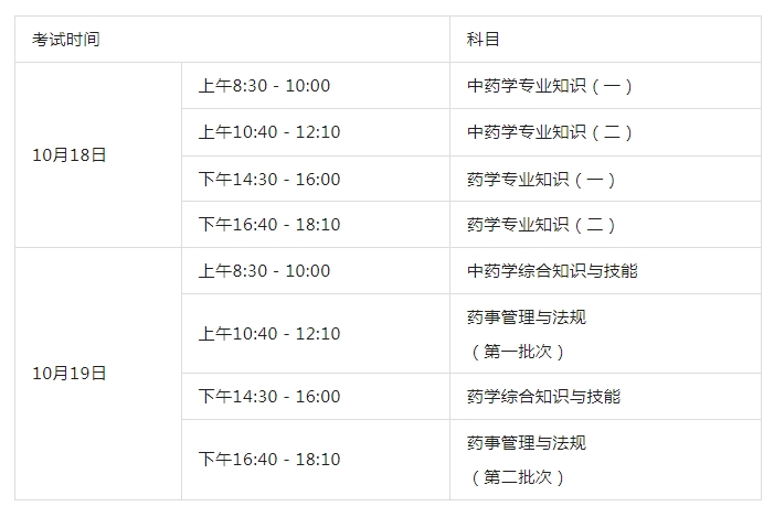 考试分4个半天实施,每半天组织2个场次,每个场次安排一个科目,半天内2个场次之间间隔时间为40分钟。其中,“药事管理与法规”科目安排2个批次,各地具体安排视考试报名和机位情况确定。