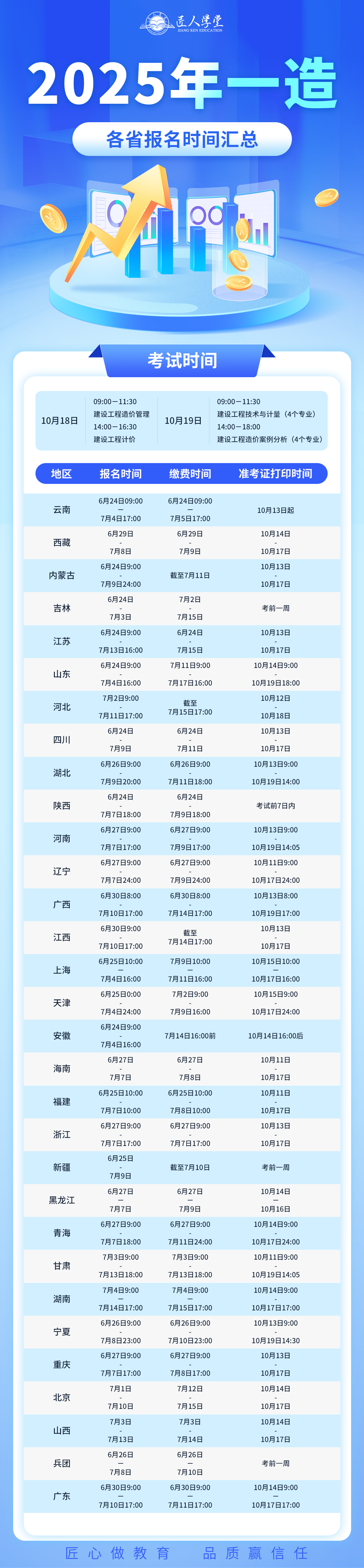 以下是2025年一级造价工程师考试各省报名时间的汇总信息(按截止时间排序),部分省份今日(7月1日)仍可报名,需特别注意时间节点: