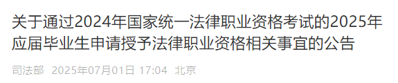 (图源司法部公众号) 原文如下: 中华人民共和国司法部公告 (第6号) 根据司法部2024年11月26日发布的公告(第13号),现就参加2024年国家统一法律职业资格考试成绩合格的普通高等学校、军队院校2025年全日制应届本科、硕士及以上学历毕业生(包括专升本、第二学士学位、专升研,下同)申请授予法律职业资格事项公告如下: 一、网上填报申请信息 参加2024年国家统一法律职业资格考试达到合格分数线的普通高等学校、军队院校2025年全日制应届本科、硕士及以上学历毕业生,应于2025年7月7日8时至9日24时,登录司法部官网或者司法部政务服务平台,自行选择受理地并填报申请授予法律职业资格的相关信息。申请人可以选择在报名地、户籍地、工作和生活所在地设区的市级或者直辖市司法行政机关申请授予法律职业资格。 报名时户籍在放宽报名学历条件地区,申请享受放宽条件政策且达到放宽合格分数线的申请人,应当选择户籍所在地设区的市级司法行政机关申请授予法律职业资格。申请人毕业后因学习、工作等原因将户籍已迁至放宽报名学历条件地方的,比照上述规定办理。 在内地就学毕业的香港、澳门、台湾地区申请人,可以选择内地司法行政机关办理申请授予法律职业资格事宜。 二、现场提交申请材料 申请人应于2025年7月14日至16日期间到受理机关指定场所现场提交申请材料。申请材料包括: (一)居民身份证件。港澳居民提交港澳居民身份证,并同时提交港澳居民居住证或者港澳居民来往内地通行证原件;台湾居民提交台湾居民居住证或者台湾居民来往大陆通行证原件。 享受放宽政策的申请人,需提供本人户口簿原件。 (二)普通高等学校、军队院校2025年学历、学位证书原件。 (三)证件照片。与本人2024年国家统一法律职业资格考试网上确认报名照片同一底片2寸(46mm×32mm)免冠彩色证件照片4张。 (四)根据审核需要提交的中国高等教育学生信息网(学信网)学历、学位查询结果,中国高等教育学历、学位认证报告等补正材料。 上述材料原件经司法行政机关审验后扫描留存归档,原件退回申请人。 司法行政机关统一受理法律职业资格申请,统一受理日期为2025年7月17日。 三、证书颁发 申请授予法律职业资格人员经审核符合授予条件的,由司法部授予法律职业资格,颁发《法律职业资格证书》。证书颁发事宜由各地司法行政机关另行通知。 司 法 部 2025年6月30日