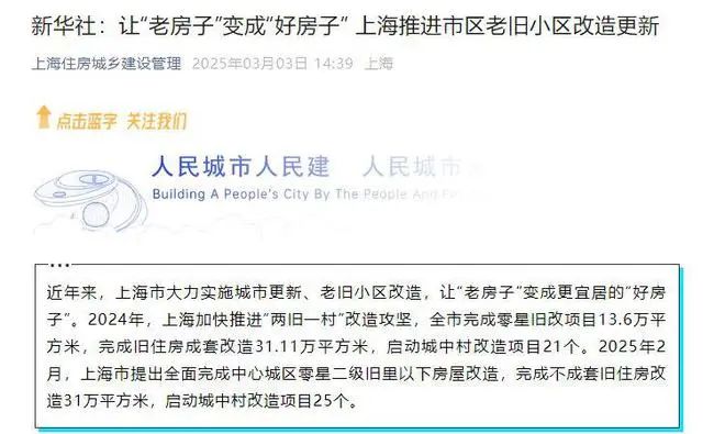 2025年2月,上海市提出全面完成中心城区零星二级旧里以下房屋改造,完成不成套旧住房改造31万平方米,启动城中村改造项目25个。