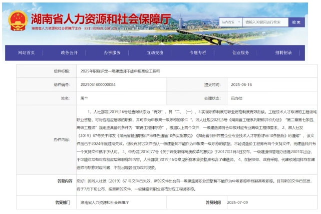 湖南省人社厅明确回复:目前一级建造师职业资格暂不能作为中级职称申报副高级职称。一级建造师能申报副高吗?人社厅回应!最近有考生申诉,人社厅又给了具体回复,一起来看~