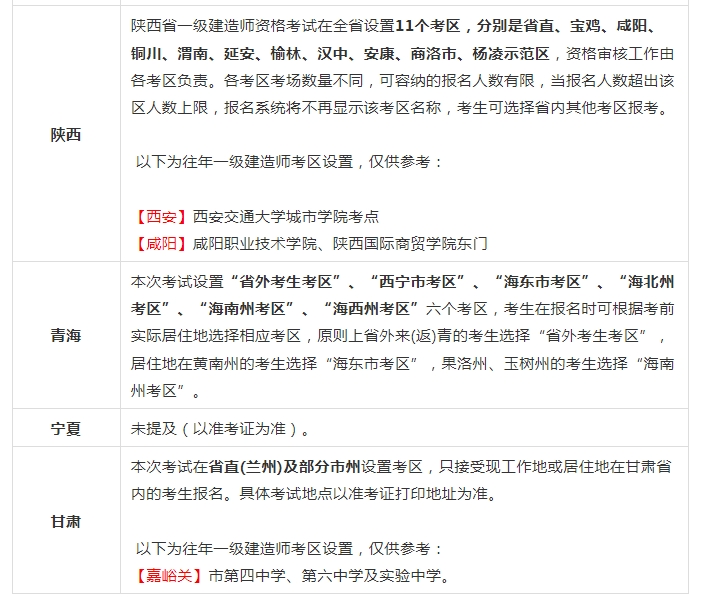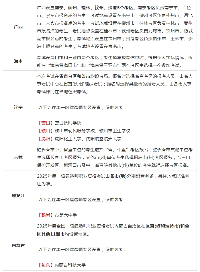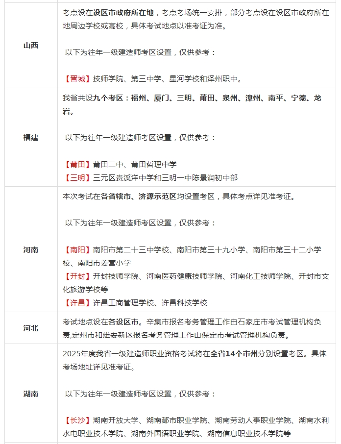 以下为各地2025年度一级建造师考试地点,内容来源于当地考务通知,具体详情如下: