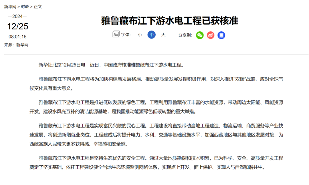 新华社2024年12月消息,中国政府已核准雅鲁藏布江下游水电工程。