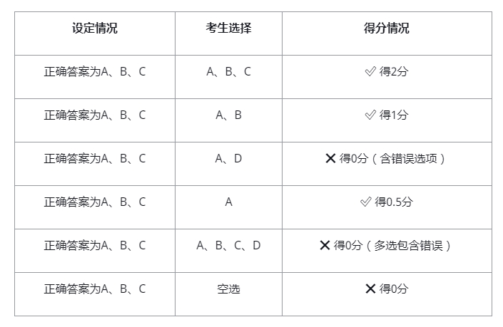 如果该题有3个正确选项(例如A、B、C),考生全部选中这三个选项且未选错其他项,即可得2分。