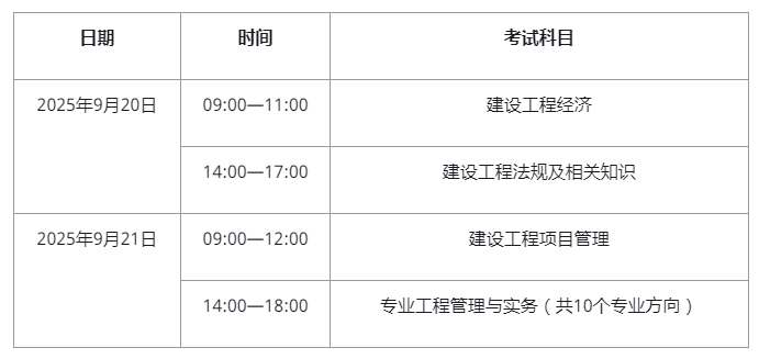 一级建造师考试共安排两天进行,具体科目和时间如下: