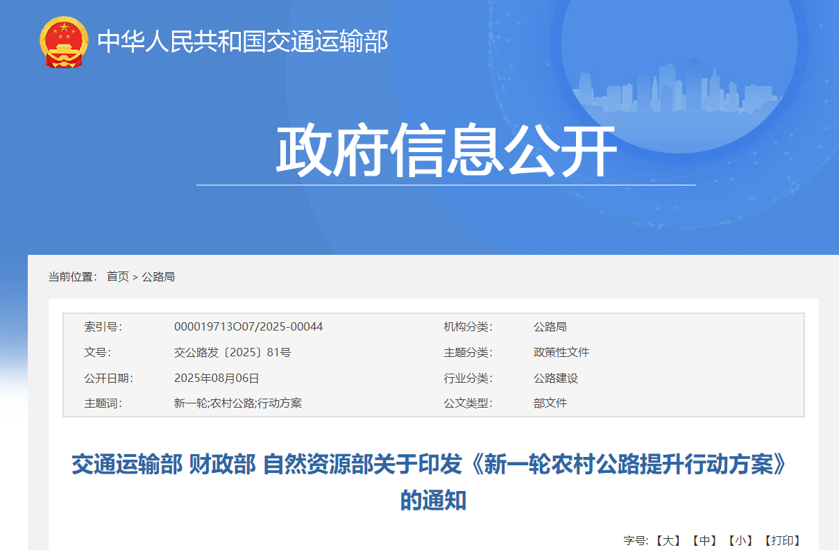 8月6日,交通运输部发布《交通运输部 财政部 自然资源部关于印发《新一轮农村公路提升行动方案》的通知》