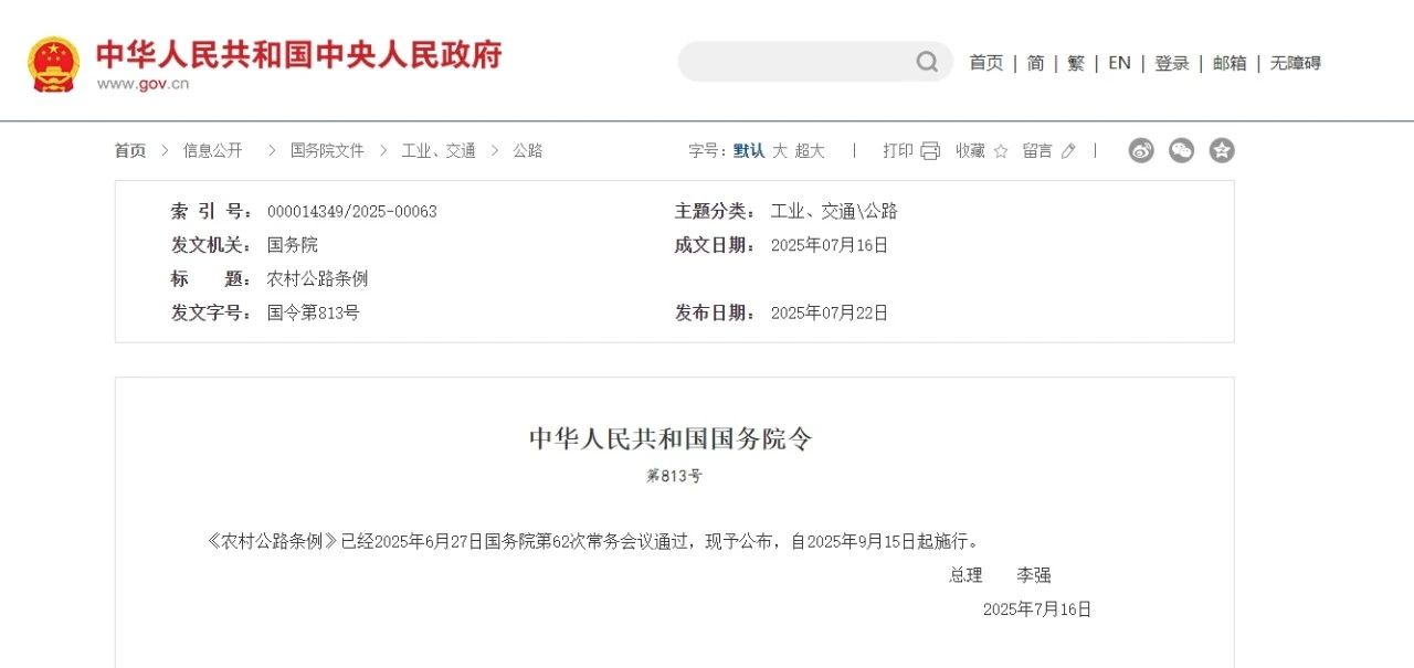 告诉大家一个好消息:国务院正式发布《农村公路条例》,自2025年9月15日起施行。