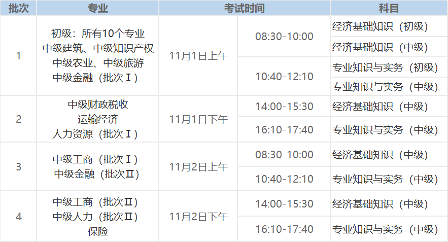 2025年初中级经济师考试时间为11月1日、11月2日,考试分4个批次考试,人力、工商分2个批次考试,不同批次的考试题目是不一样的,为了保证考试的公平性,各个批次的考试难