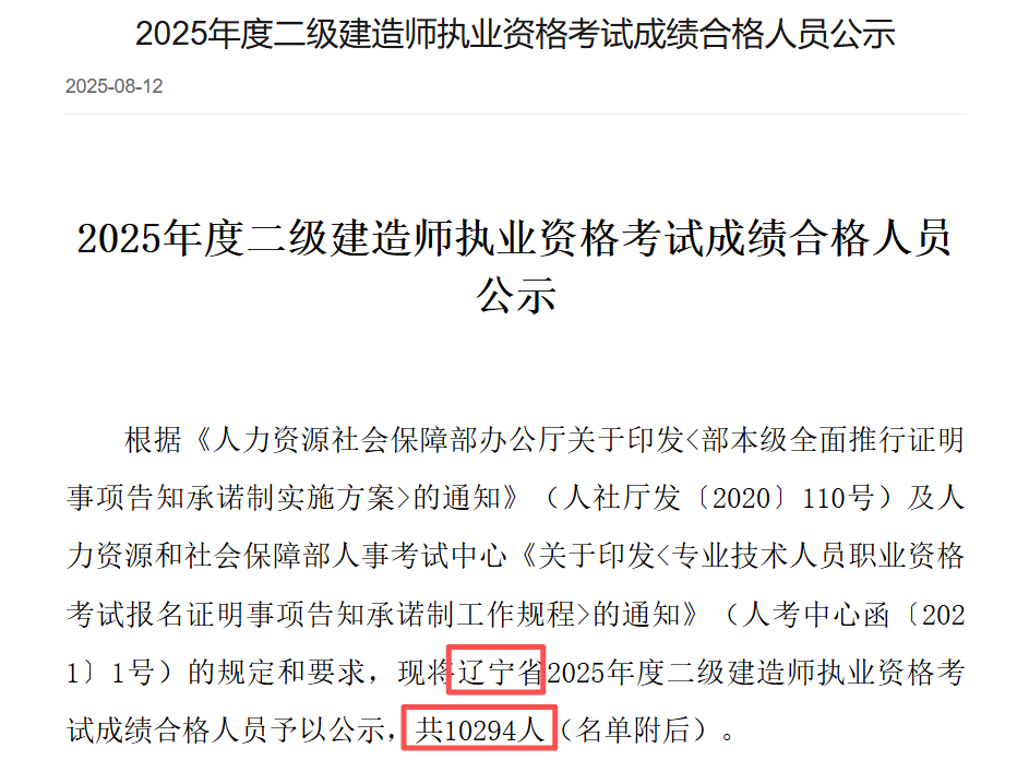 以辽宁为例,2025年二建合格名单显示只有10294人,与去年公示的12080人相比,少了两千人。