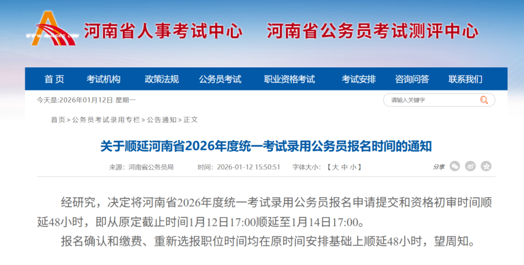 经研究,决定将河南省2026年度统一考试录用公务员报名申请提交和资格初审时间顺延48小时,即从原定截止时间1月12日17:00顺延至1月14日17:00。 报名确认和缴费、重新选报职位时间均在原时间安排基础上顺延48小时,望周知。 ⭕报名 报名时间:2026年1月6日9:00至1月14日17:00期间 报名入口:河南省人事考试中心网站(http://www.hnrsks.com)“河南省2026年度统一考试录用公务员专栏”进入报名系统 ⭕报名确认和缴费 1、报名确认及缴费时间:2026年1月18日9:00至1月22日17:00 2、报名确认及缴费入口:登录河南省人事考试中心网站(http://www.hnrsks.com)进行报名确认和缴费。 3、缴费标准:根据省发展改革委、省财政厅批准的收费标准,报考者按每人每科30元缴纳笔试考务费。 4、最低生活保障家庭报考者可直接与当地人事考试机构联系办理报名确认和减免费用手续。逾期未完成网上报名确认并缴费的,按主动放弃处理。 5、本次考试在各省辖市均设置考点,报考者缴费前可自行选择1个考点城市。 6、各招考职位的报名缴费人数与计划录用人数的比例应当不低于5:1。对原国家连片特困地区重点县、国家扶贫开发重点县和省定扶贫开发工作重点县的乡镇(不含城关镇)职位,报名缴费人数与计划录用人数的比例可放宽到3:1。达不到以上规定比例要求的,相应核减该职位的计划录用人数直至取消该职位。核减、取消职位情况,以及报考职位被取消的人员名单、重新选报职位的要求,统一在河南省人事考试中心网站公布。 7、报考职位被取消的人员,可于取消职位公布后至2026年1月26日17:00期间,登录河南省人事考试中心网站重新选报其他职位(不得再报考已公布的取消职位)。未能重新选报职位的,按主动放弃处理,退还缴纳的笔试考务费。