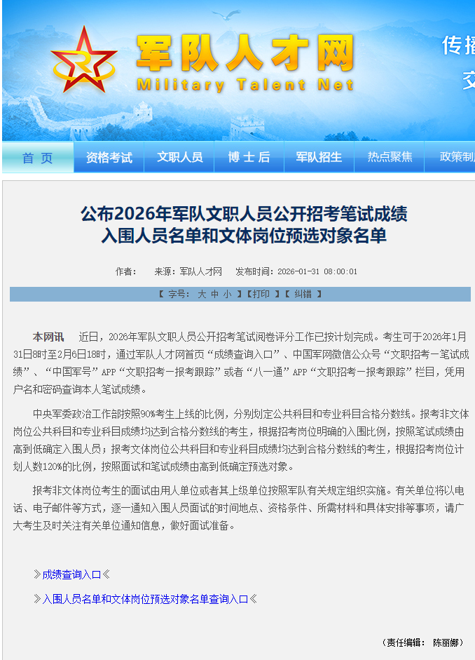本网讯 近日,2026年军队文职人员公开招考笔试阅卷评分工作已按计划完成。考生可于2026年1月31日8时至2月6日18时,通过军队人才网首页“成绩查询入口”、中国军网微信公众号“文职招考—笔试成绩”、“中国军号”APP“文职招考—报考跟踪”或者“八一通”APP“文职招考—报考跟踪”栏目,凭用户名和密码查询本人笔试成绩。
