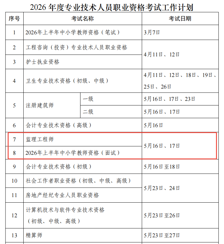 为切实做好专业技术人员职业资格考试规划与管理工作,方便广大专业技术人员参加职业资格考试,经征求有关部门同意,现就2026年度专业技术人员职业资格考试工作计划及有关事项通知如下: