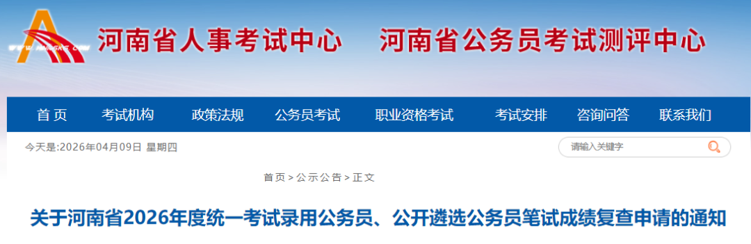 关于河南省2026年度统一考试录用公务员、公开遴选公务员笔试成绩复查申请的通知