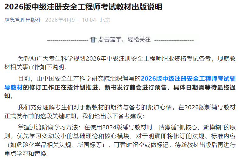 4月9日上午应急管理出版社发布2026版中级注册安全工程师考试教材出版说明