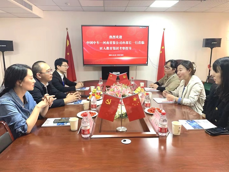 2023年10月26日,中国中车—河南中车重装公司人力资源部负责人孙部长一行莅临匠人教育集团总部考察指导,匠人教育集团董事长潘胜旺,副总经理谢丹、KA事业部负责人王旭、营销总监齐保华给予了热情接待,随同参观了匠人教育集团办公区域、教学场地、实操基地、教学研究院、运营中心等。