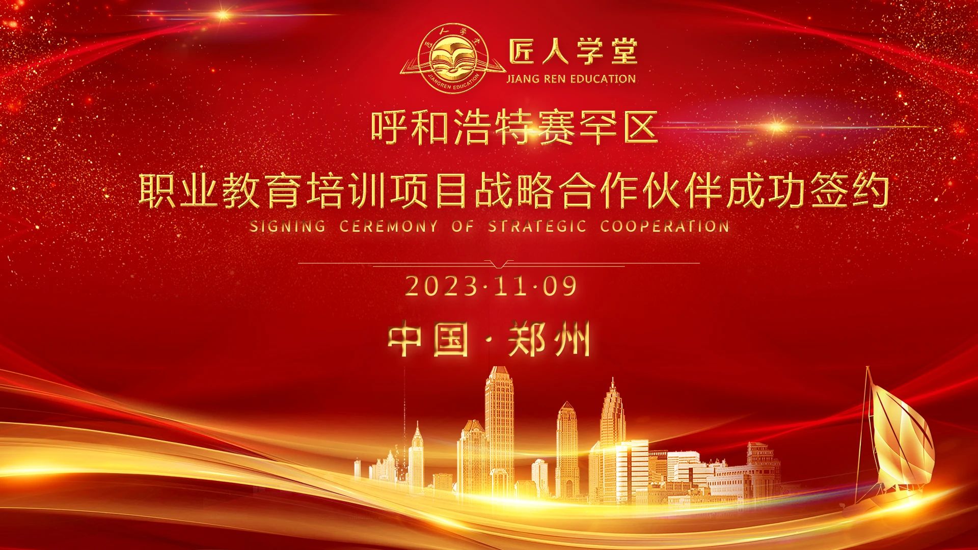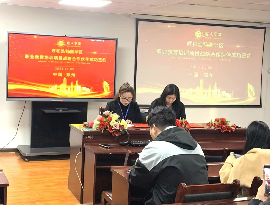 2023年11月09日下午,匠人教育集团与呼和浩特赛罕区校区职业教育培训项目战略合作伙伴签约仪式在郑州成功举办!匠人教育集团副总杨素云,呼和浩特赛罕区校区安总、刘校长等出席签约仪式,匠人教育集团建工事业部马经理、KA事业部王总、教学部负责人赵总、公考负责人丹总、项目部谢总、市场部闫总等参加签约仪式!仪式由运营部总监马志杰主持!