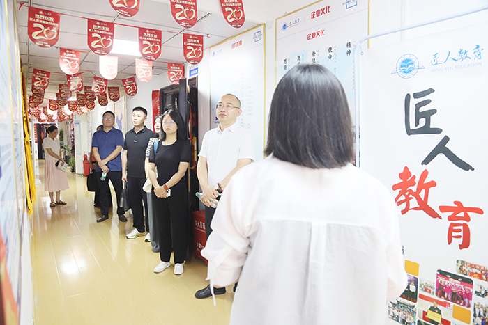 朱书记一行在匠人教育集团董事长潘胜旺等领导的陪同下,先后走访了匠人集团总部和匠人工坊实训基地。在品牌事业部徐老师的细致讲解中,朱书记一行系统了解了匠人集团20年深耕职业教育领域的发展历程,尤其对集团在就业导向型培训方面的积累给予高度认可。在匠人工坊实训基地,当看到模拟真实职场环境的实训工位、与行业前沿同步的教学设备,以及学员们全神贯注的实操状态时,朱书记特别强调:"在就业竞争如此激烈的今天,这种沉浸式实操训练是让学生从'校园人'快速转变为'职场人'的关键,直接决定了他们在就业市场的核心竞争力。"