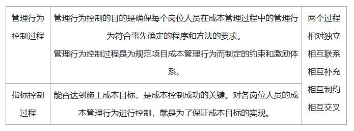 一是管理行为控制过程;二是指标控制过程。管理行为控制是对施工成本全过程控制的基础,指标控制则是成本控制的重点。两个过程既相对独立又相互联系,既相互补充又相互制约。